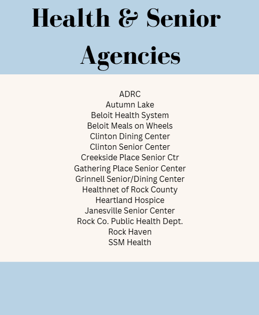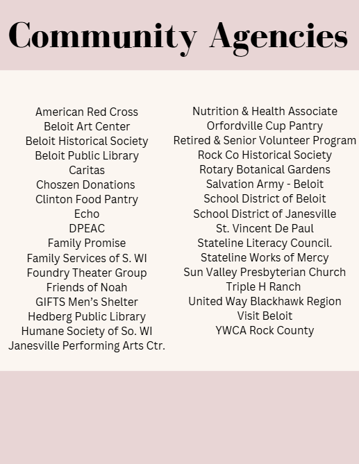 RSVP volunteers meet community needs throughout Rock County, Wisconsin and Northern Winnebago County, Illinois. Volunteer opportunities may exist for RSVP members through partnerships with the following agencies and programs: