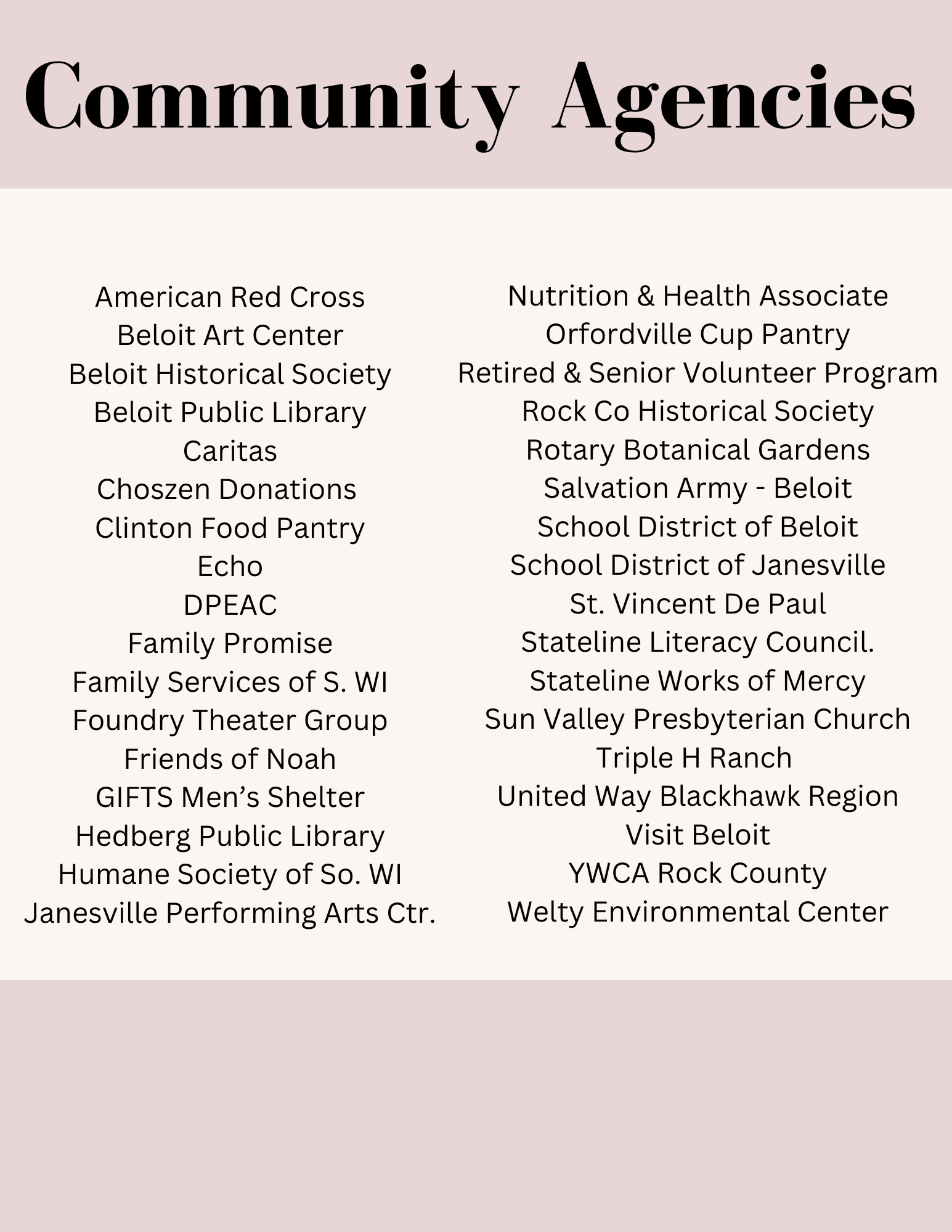 RSVP volunteers meet community needs throughout Rock County, Wisconsin and Northern Winnebago County, Illinois. Volunteer opportunities may exist for RSVP members through partnerships with the following agencies and programs: