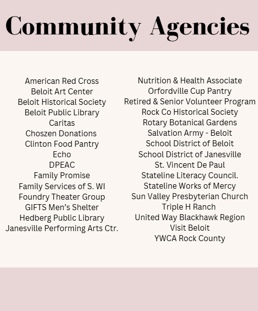 RSVP volunteers meet community needs throughout Rock County, Wisconsin and Northern Winnebago County, Illinois. Volunteer opportunities may exist for RSVP members through partnerships with the following agencies and programs: